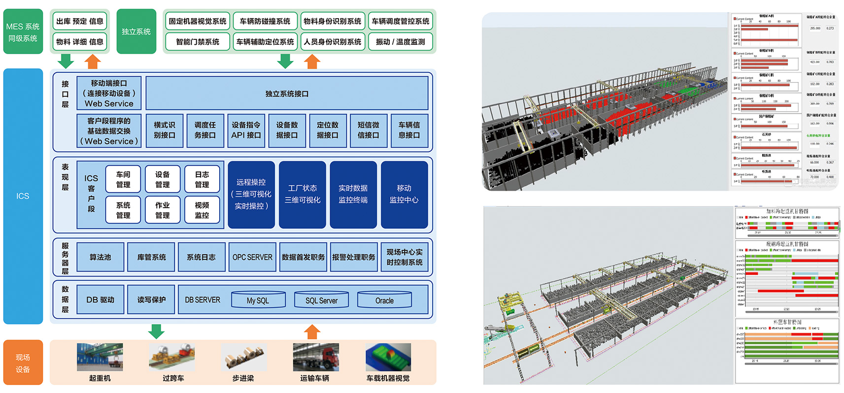 智能起重輸送是包含了庫(kù)區(qū)管理、調(diào)度算法、智能搬運(yùn)等子系統(tǒng),形成了感知、決策、執(zhí)行的智能化整體解決方案。該系統(tǒng)在標(biāo)準(zhǔn)的生產(chǎn)流程、規(guī)范的操作過(guò)程的基礎(chǔ)上,通過(guò)位置傳感器、機(jī)器視覺(jué)等感知設(shè)備狀態(tài)、庫(kù)存狀態(tài)等環(huán)境信息,經(jīng)庫(kù)區(qū)智能管理系統(tǒng)分析后自主分解生產(chǎn)計(jì)劃,通過(guò)智能調(diào)度、路徑規(guī)劃等技術(shù)形成運(yùn)行指令,通過(guò)自主控制、精確定位等技術(shù)由智能設(shè)備自主完成任務(wù)指令并反饋執(zhí)行結(jié)果。該系統(tǒng)還具有遠(yuǎn)程運(yùn)維、云服務(wù)及移動(dòng)推送等功能,實(shí)現(xiàn)全生命周期管理和現(xiàn)場(chǎng)實(shí)時(shí)監(jiān)控。
