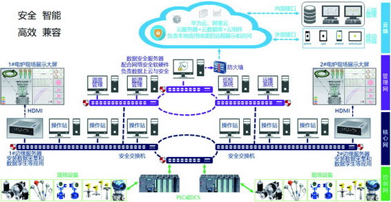 優勢:包含控制網、核心網、管理網以及云端四級工廠網絡,兼容開放性好,設置軟硬件結合的縱深防御措施,安全性好,根據實時參數,按照模型進行仿真,推薦合理的運行參數,結合礦熱爐工藝參數、運行參數,計算出電極工作端實際位置