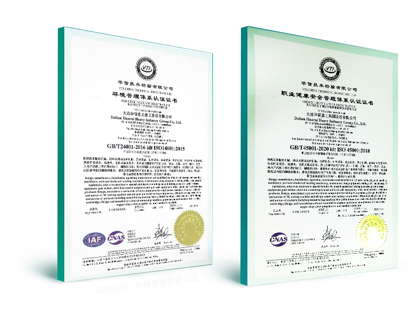 大連重工在確保公司產品、活動和服務符合國際職業健康安全和環境的政策、法律、法規及其他的要求,公司順利通過了'ISO45001職業健康安全管理體系認證和 'ISO14001' 環境管理體系認證,持續保持并改進。